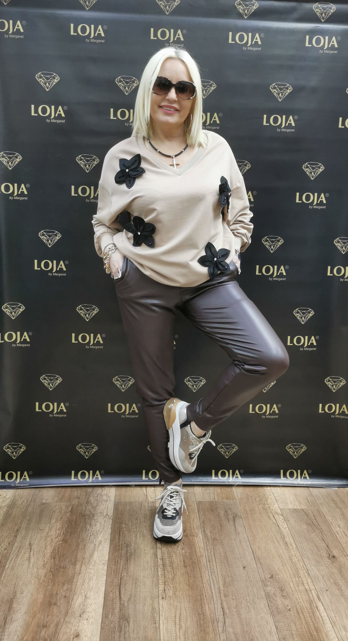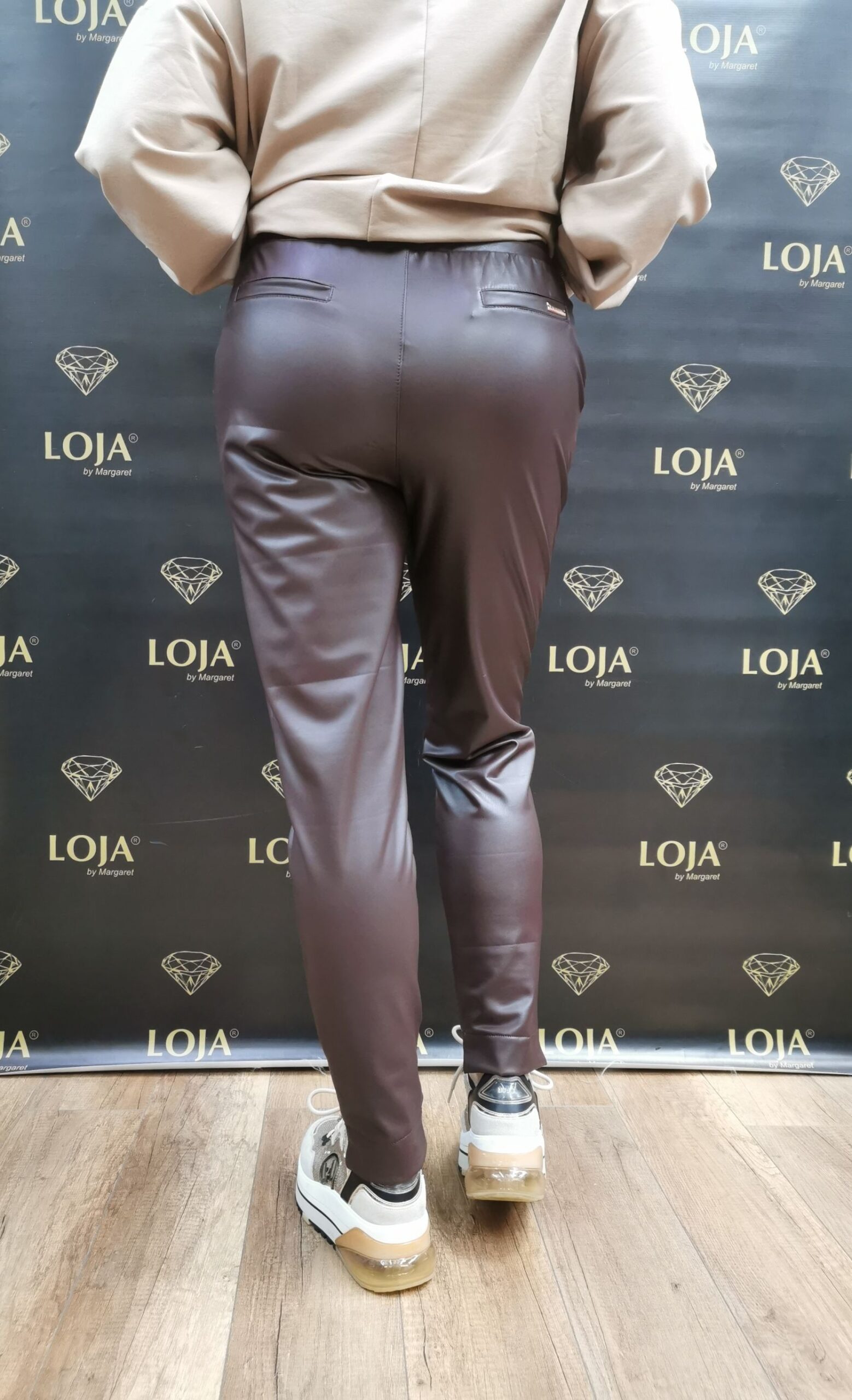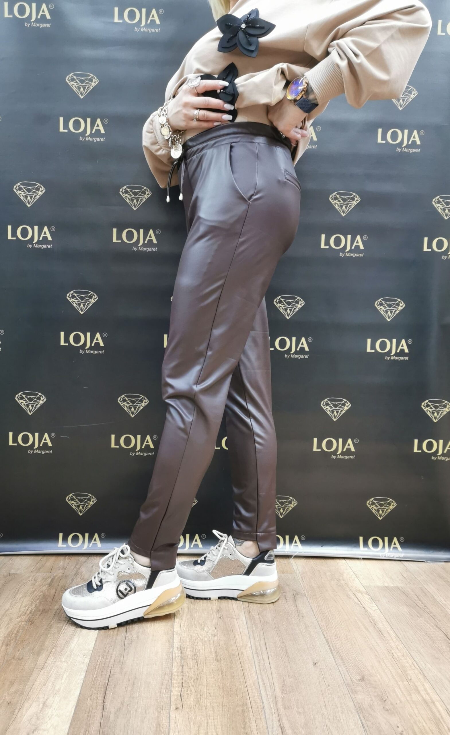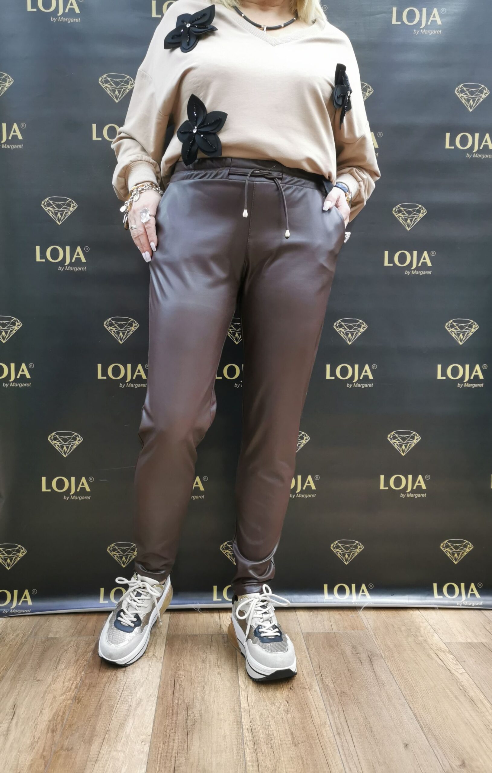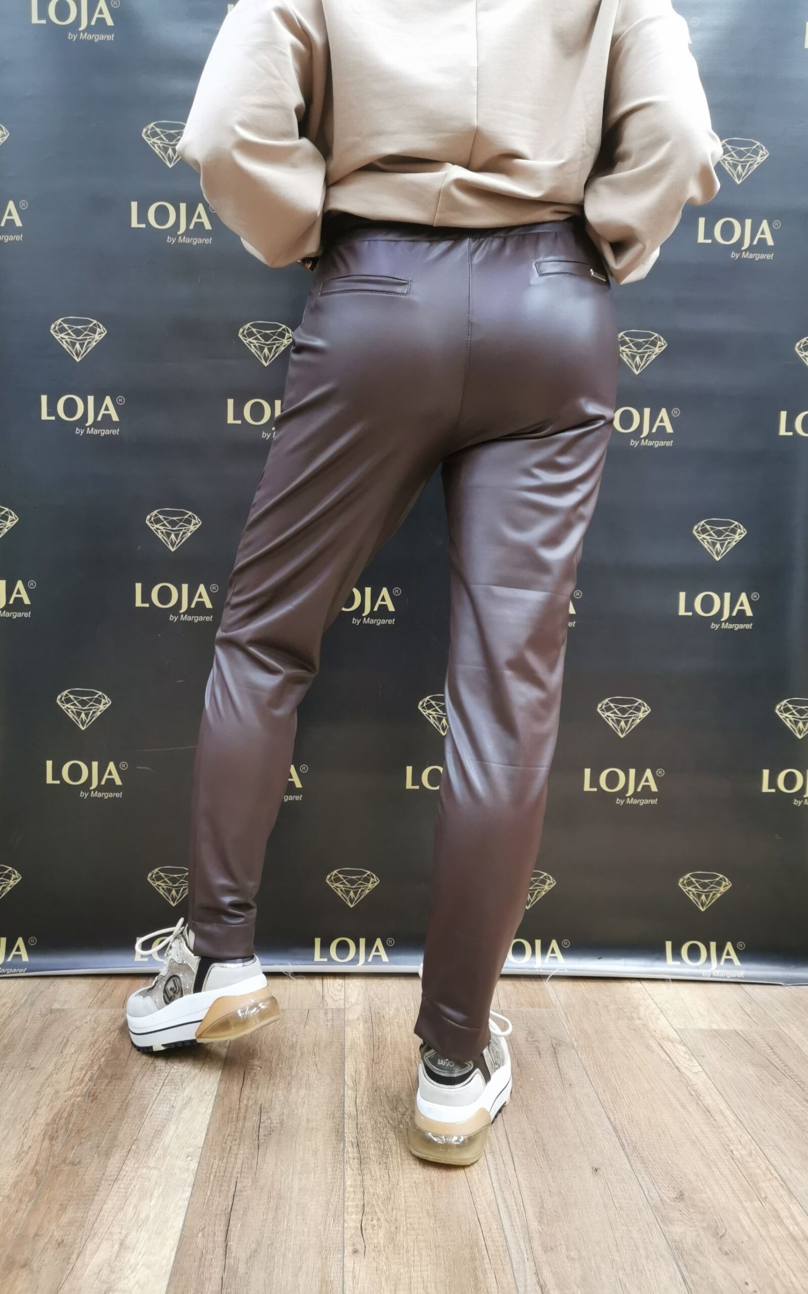 Spodnie typu jogger, w kolorze czekoladowym .Rozmiarowe spodnie wykonane z tworzywa imitującego skórę. Spodnie z szeroką gumką w pasie, wiązane sznurkami z eko skórki. Luźniejsze spodnie, zwężane w kostce, bardzo wygodne, oraz miłe do ciała. Jestem pewna, jeżeli lubisz skórę to będziesz bardzo zadowolona.