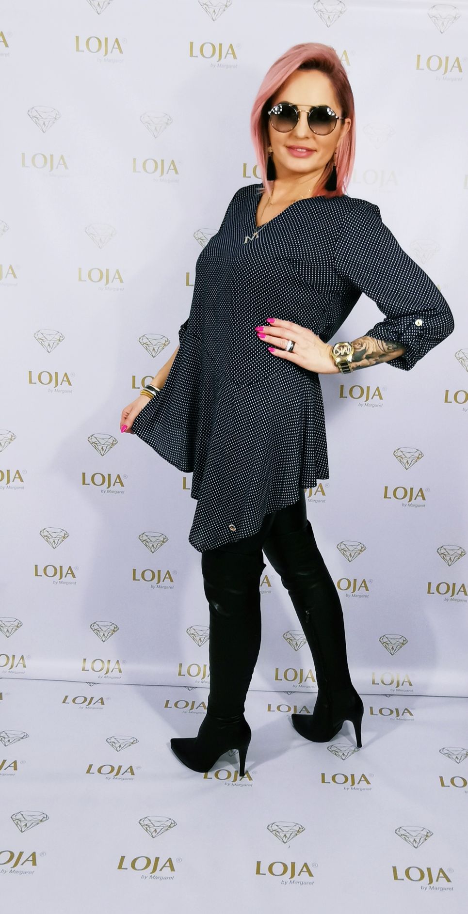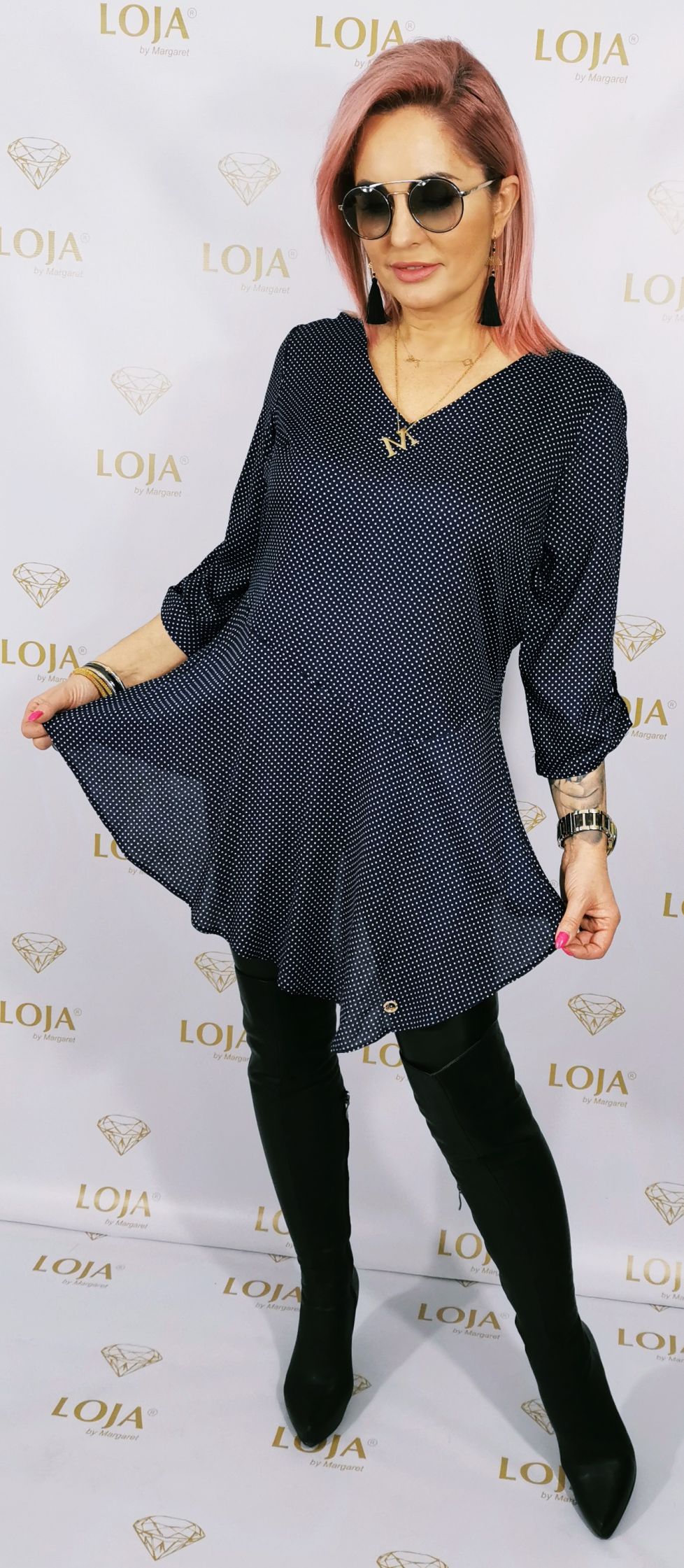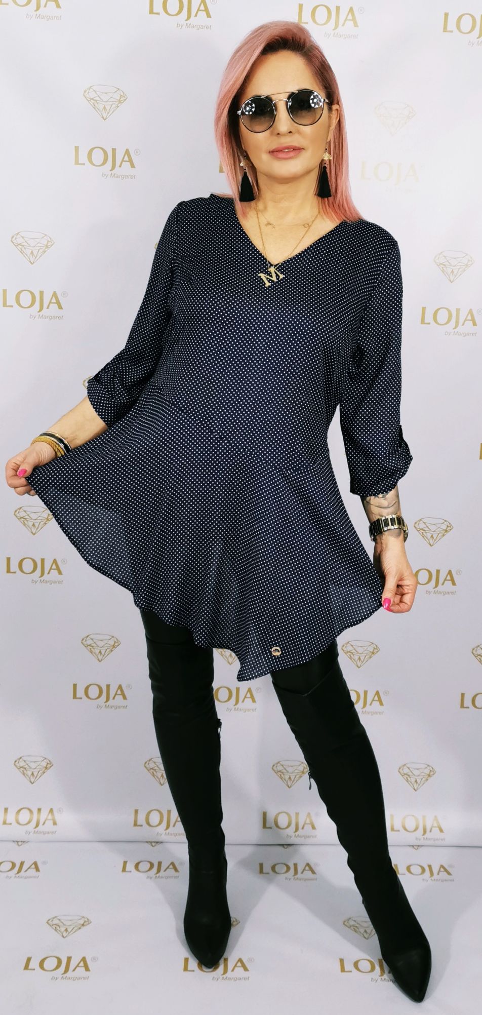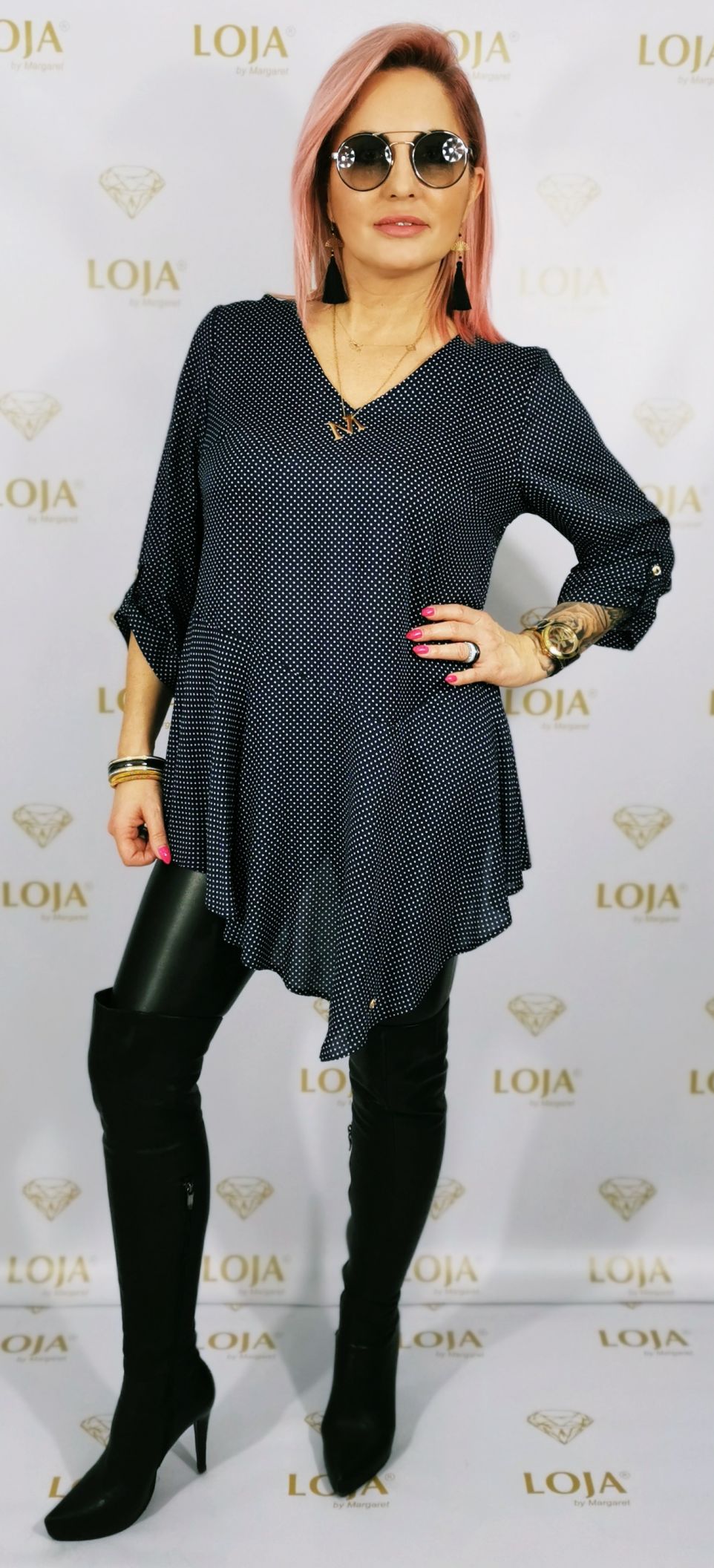 Tunika w groszki, leciutka, wiosenna, niezwykle kobieca. Z przodu lekko przedłużana, rękaw podpinany 3/4. Dekolt w serek.                                                                                                                                                                                   Rozmiar: S/M, M/L, L/XL                                                                                              Kolor: Granatowy, błękitny                                                                                         Skład: 70%poliester, 30%wiskoza