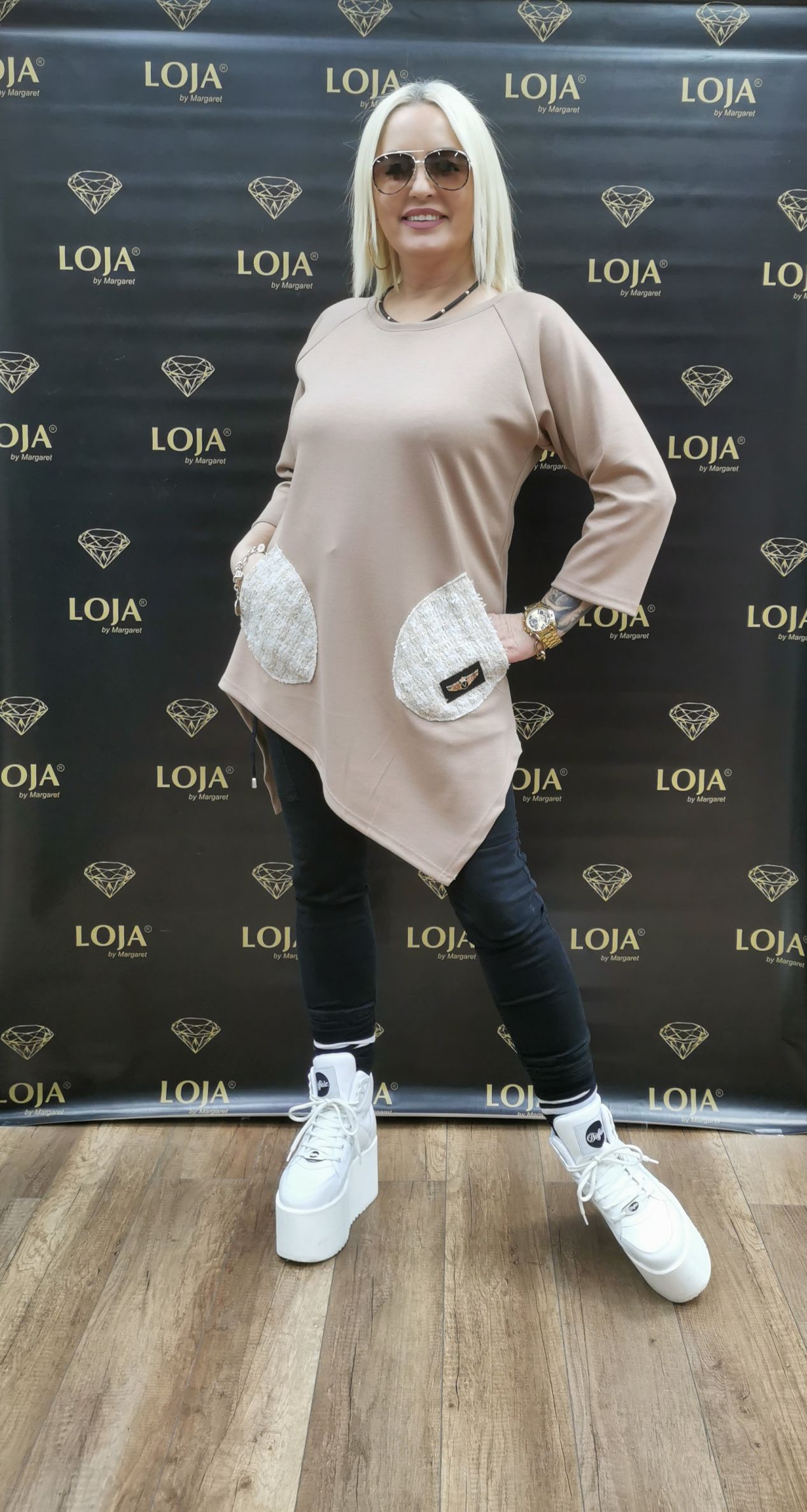Beżowa tunika z dwoma kieszonkami kontrastowymi. Swobodny krój i przyjemny w dotyku materiał zapewnią Ci wygodę noszenia.