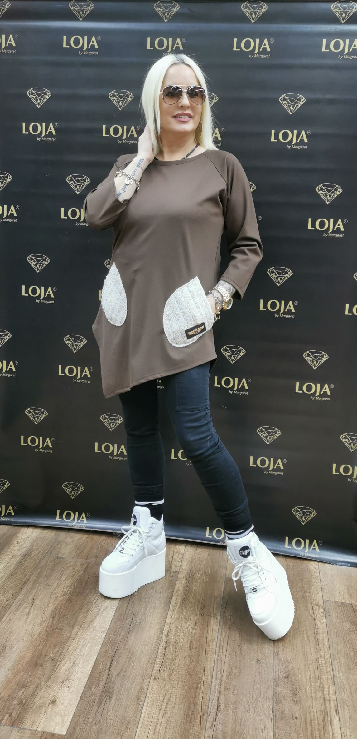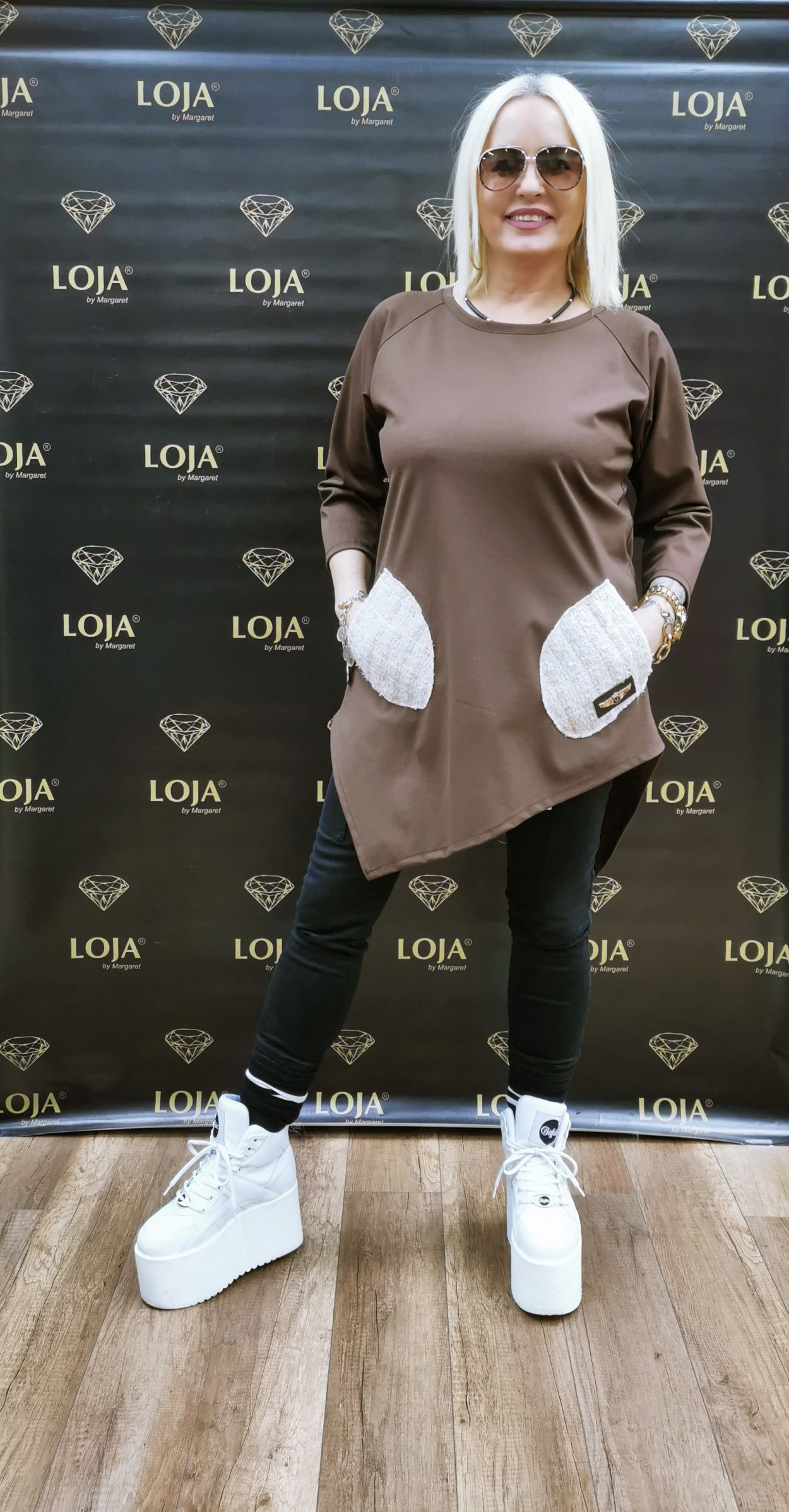 Brązowa tunika z dwoma kieszonkami kontrastowymi. Swobodny krój i przyjemny w dotyku materiał zapewnią Ci wygodę noszenia.